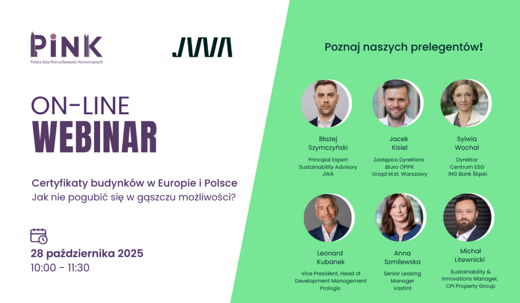 Polska Izba Nieruchomości Komercyjnych zaprasza na wydarzenie online na temat certyfikacji budynków „Certyfikaty budynków w Polsce i Europie: Jak nie pogubić się w gąszczu możliwości?” Partnerem merytorycznym webinaru jest firma doradcza JWA.